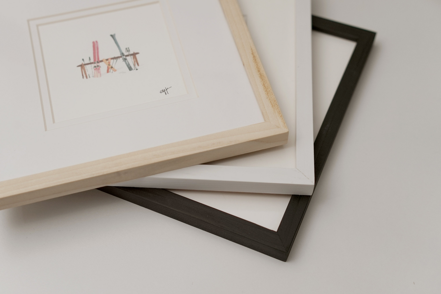 Our frames are handmade in our home in Denver with cedar wood and include a double mat. We use premium, thick acrylic covers that are durable and look as good as glass.